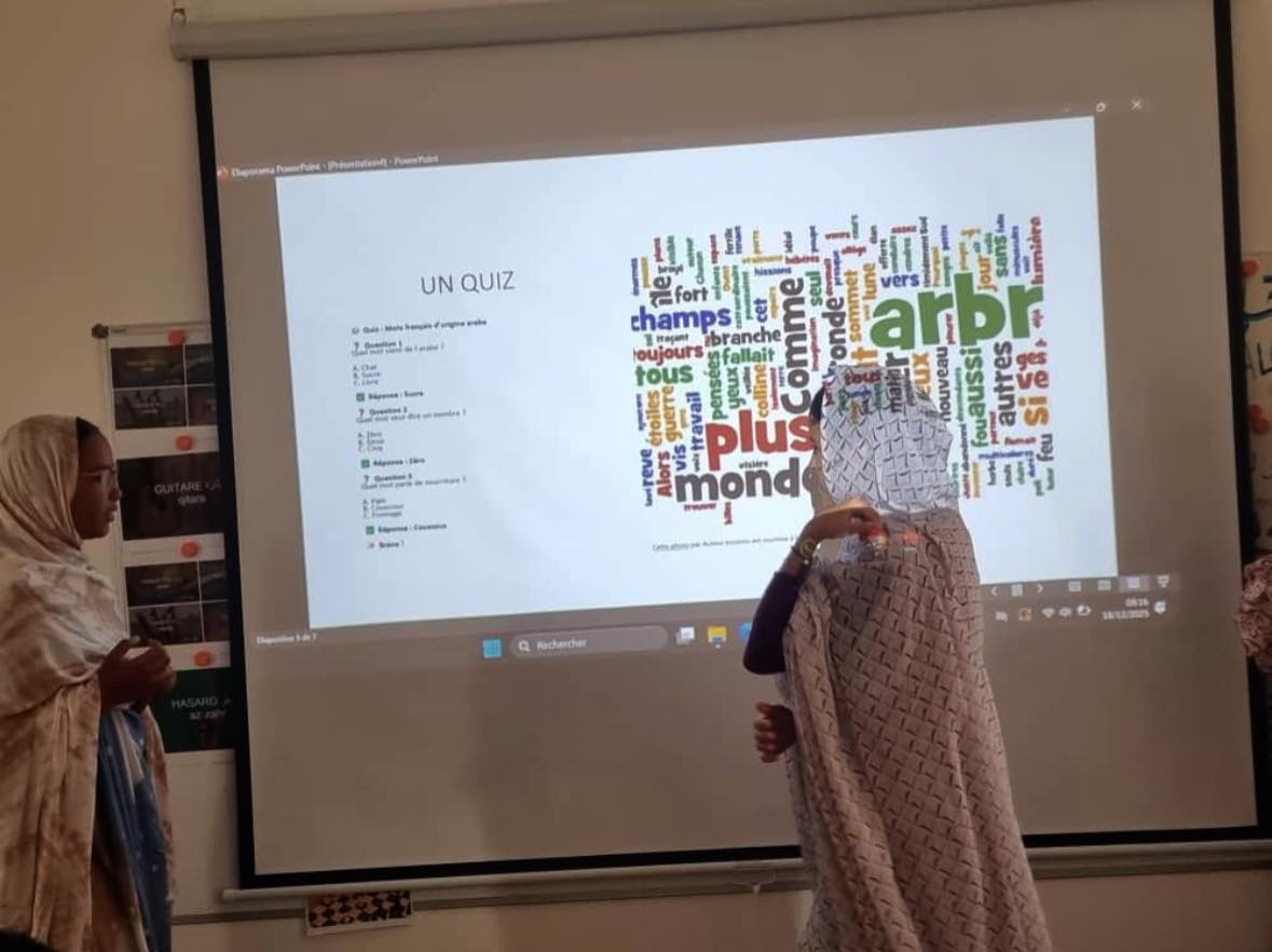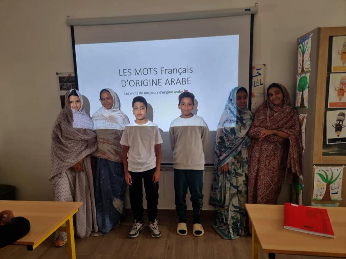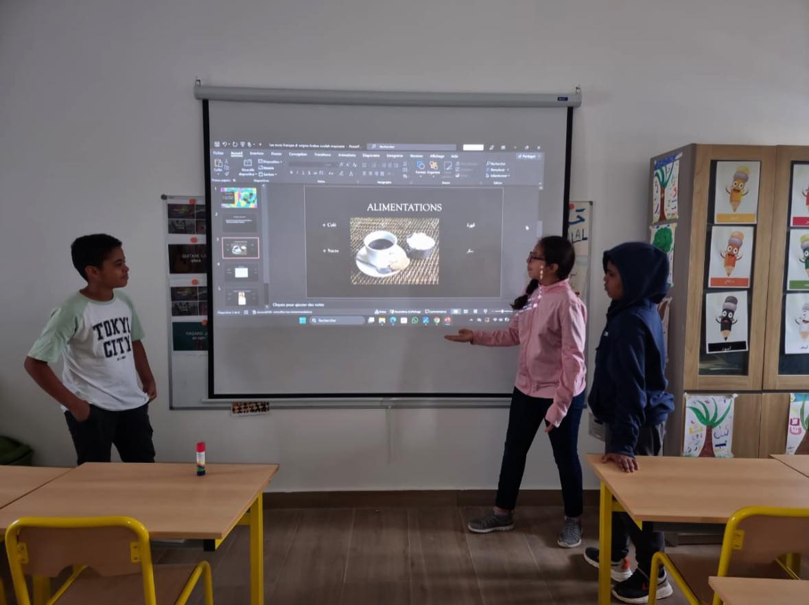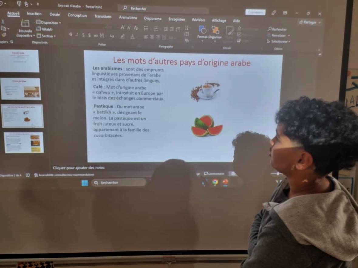 À l’occasion de La Journée mondiale de la langue arabe, les élèves de 6ᵉ ont présenté aux CP et CE1 leur projet passionnant sur les mots français d’origine arabe, à travers un PowerPoint.
